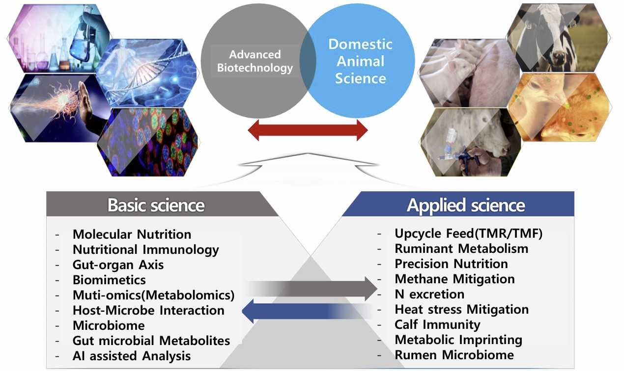 우리 연구실은 반추동물의 소화와 생리대사 이해를 기반으로, 친환경적 반추동물 생산과 동물의 강건성(면역) 향상을 위한 영양대사적 조절 기술 개발을 목표로 합니다. 이를 위해 균형감 있는 기초연구와 응용연구를 기반으로 최신의 생명공학 기술들을 적극적으로 동물 영양사양 분야에 적용하고자 합니다.